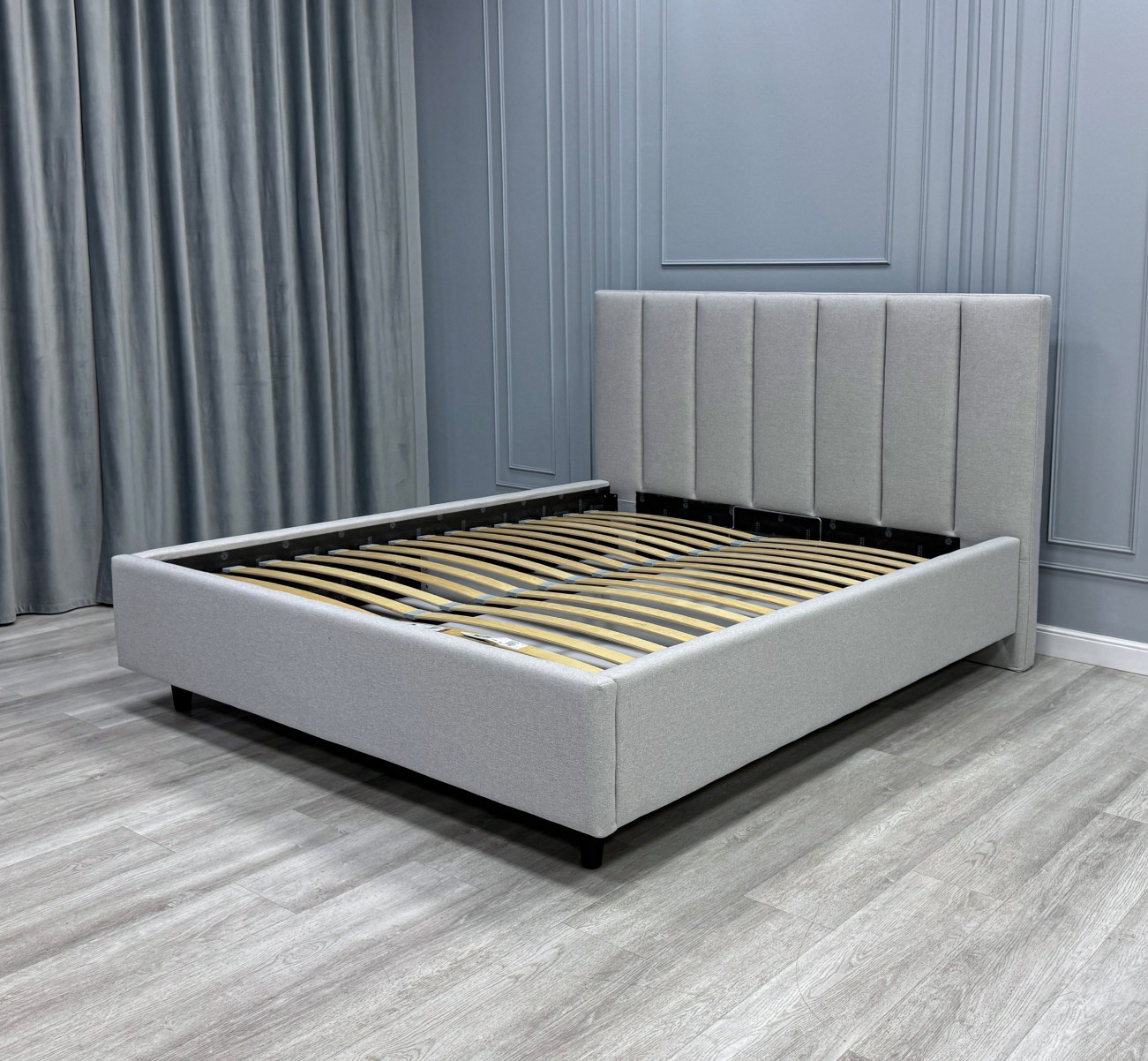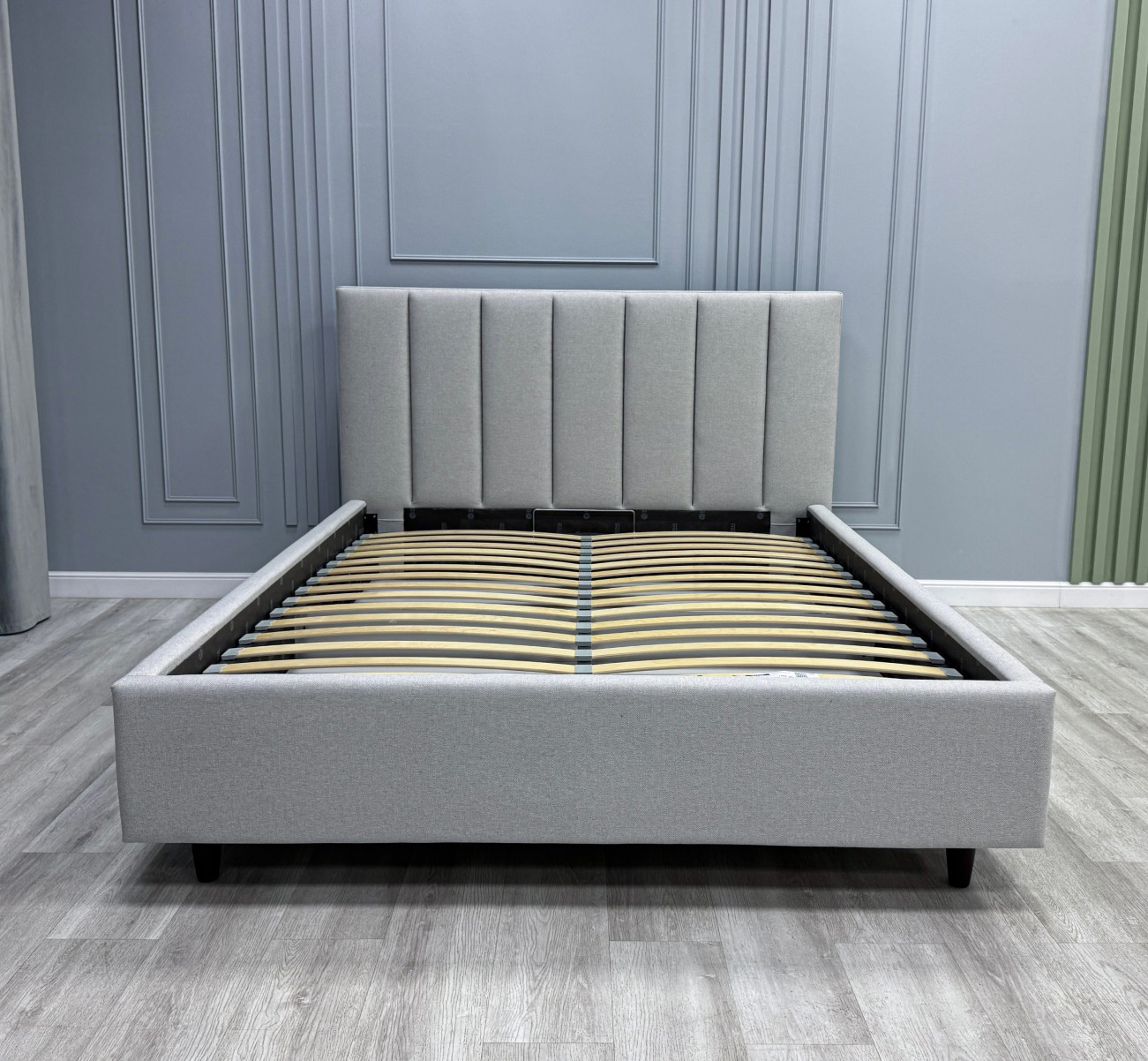 - Изголовье кровати выполнено вертикальными линиями. Данный дизайн актуален и отлично впишется в любой современный интерьер.